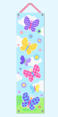 Our Butterfly Garden growth chart will bring a little bit of spring time all year round! Your child will love seeing our colorful fluttering butterflies filled with sweet pastel patterns, bouquets of flowers and blue skies! This playful growth chart is ready to hang and will instantly make an exciting change in your kids bed or play room. Growth Chart measures 12 x 43 inches and is marked for measuring both inches & centimeters. Printed on high-quality canvas. Corners have grommets and include a 28" decorative pink grosgrain ribbon & tacks for easy hanging. Mark wall with a pencil 60 inches up from the floor, line up the pencil mark with the 60 inch mark on the growth chart and hang on wall.