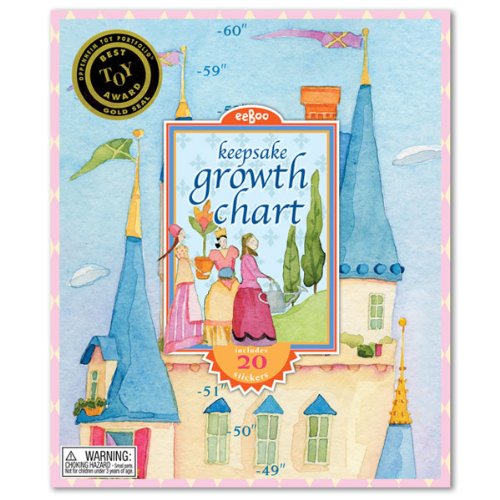 Up in the Castle Growth Chart illustration by Melissa Sweet is a beautiful gift, certain to be treasured! eeBoo's unique format includes a beautifully illustrated, heavily laminated chart that folds up and fits inside a sturdy gift box. Measures up to 60 inches. The chart comes with 20 stickers for marking Birthdays and other important occasions. A perfect gift idea for a new baby!!