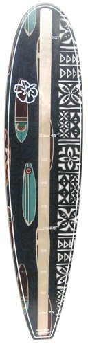 "Made of wood with a beautiful hawaiian fabric inlay, these surfboard shaped growth charts are a fun and stylish way to keep track of growing kids. Specs: 45 Long X 10"" Wide X 1/2"" Thick. The measurements on the chart start at 24"" and are marked every 3"" up to 63"". Numerical inch demarcations are at 24"", 36"", 48"", and 60"".