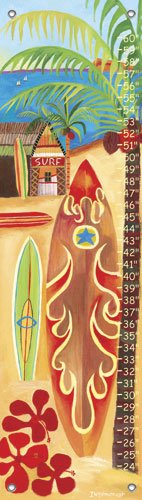 Surfs up! Track your little surfers height with this totally rad canvas growth chart. Our kid's growth charts are created on the same artist?s canvas as our stretched wall art. They come with grommets in four corners making them easy to hang with the provided decorative tacks. This product creates a great childhood keepsake, and rolls up easily for safe storage. The growth chart can be wiped clean with a soft, dry or slightly damp cloth and should it wrinkle, the backside may be ironed on a low setting with light steam. A permanent marker (not included) is a great way to mark dates or ages on the chart.